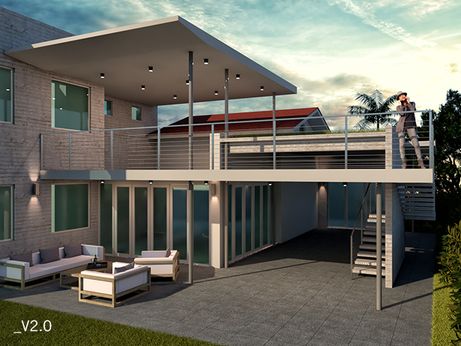 V1.0: The first version has a concrete bar top on the first level and the second level is completely covered.