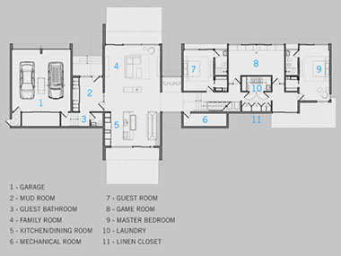 CASA BÚHO is a new 4,500sf single-family residence in Stowe, VT. The 5-acre site inspired the building placement. The house will be located on the highest point of the site, near a huge boulder that becomes the kitchen & dining area backdrop. The design is focused on three main volumes intertwined with smaller volumes that create transitional spaces in the residential program. In the east wing, the bedrooms face north into the woods, maintaining the corridors on the south side. In the center, the family room, kitchen, and dining room share a large open plan with glass doors on the north and south side of the space. The garage sits in the west wing, becoming one of the main volumes.