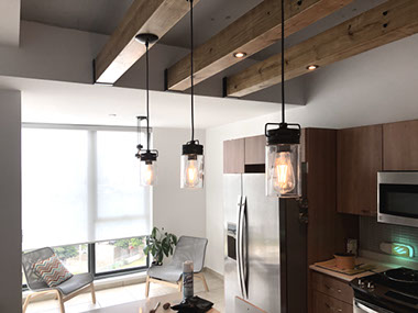 CIUDADELA APARTMENT 2 is a two-bedroom apartment that needed some character. The kitchen gypsum board ceiling was removed to expose the raw concrete. Metal purlins were covered with wood to construct lightweight beams that would hold all the kitchen lighting and create a unique ceiling area in the apartment.